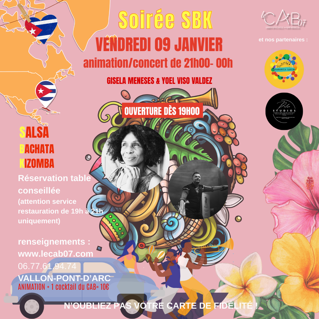 Soirée SBK au CAB 07 – Salsa, Bachata, Kizomba avec Gisela Meneses & Yoel Viso Valdez. Restauration dès 19h, animation/concert de 21h à 00h. Réservations : www.lecab07.com